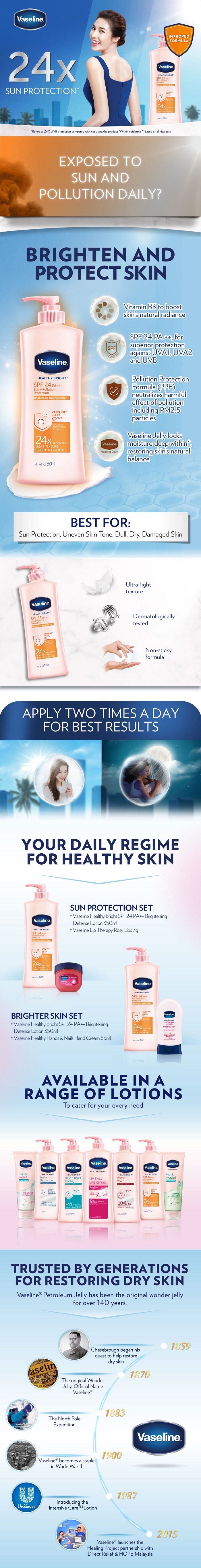 Product Details - Vaseline Healthy White SPF24 PA++ Body Lotion brightens and protects for noticeably healthy-looking fairer skin even under harsh sun - SPF 24 PA++ superior protection to prevent formation of dark spots and uneven pigmentation caused by UVA and UVB rays - Contains Vitamin B3 and antioxidants that helps skin look brighter by working deep inside the skin* - inhibiting melanin transfer to help reduce the appearance of wrinkles, uneven tone and dark spots - Micro-droplets of Vaseline® Jelly restore moisture